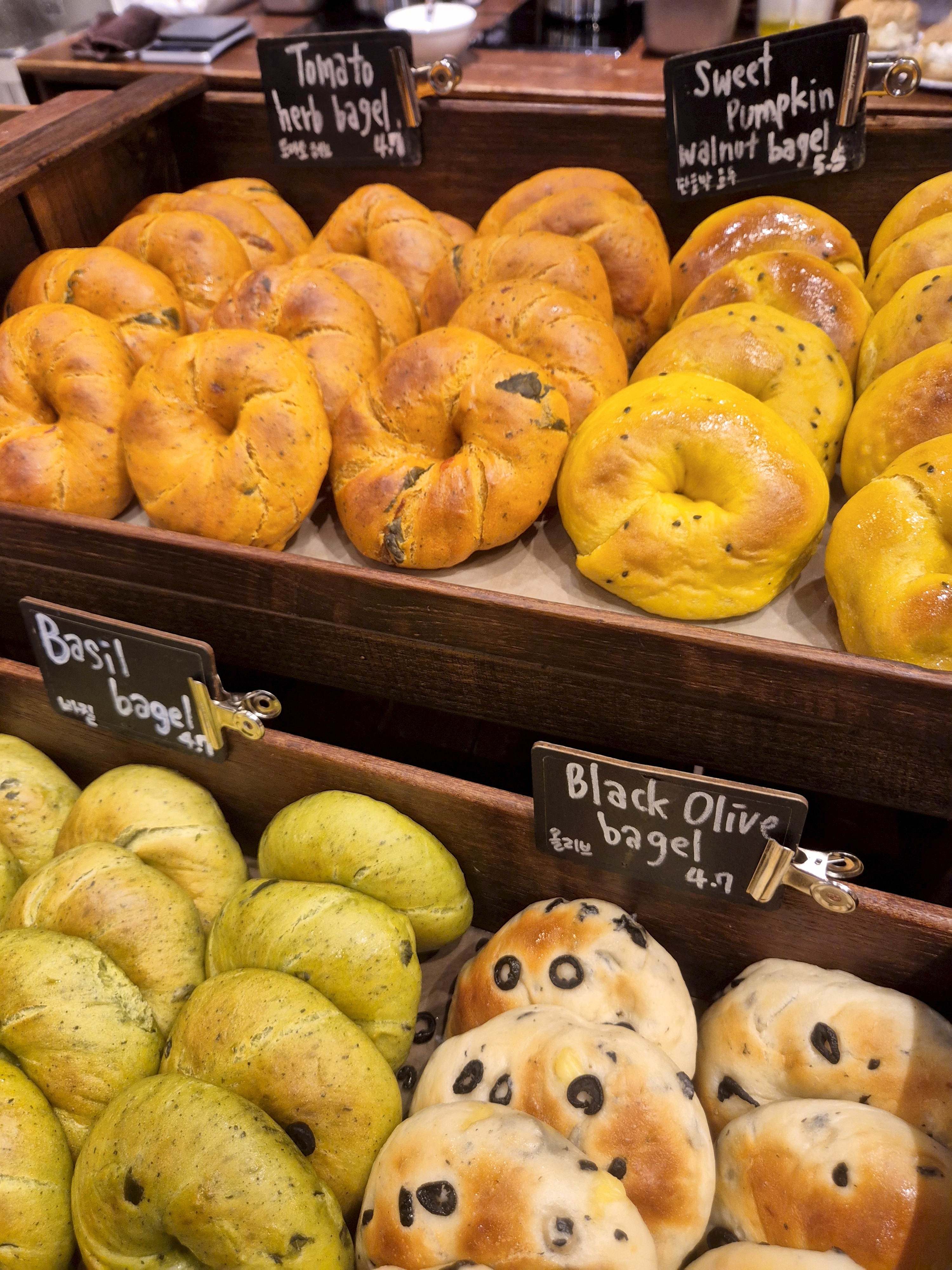 베이글 종류를 미리 좀 봐두긴 했는데 결국 막상 가서는 느낌대로 골라버렸는 것... 일단 들어가면 차례대로 줄을 서서 베이글이 놓인 진열대를 천천히 이동한다. 나는 먼저 블루베리 베이글을 집어들었다. 맛있다는 후기도 보았고 평상시에 베이글 집에서 블루베리 베이글이 항상 아쉬웠기 때문에 과연 여기는 맛이 어떨지 궁금했다.